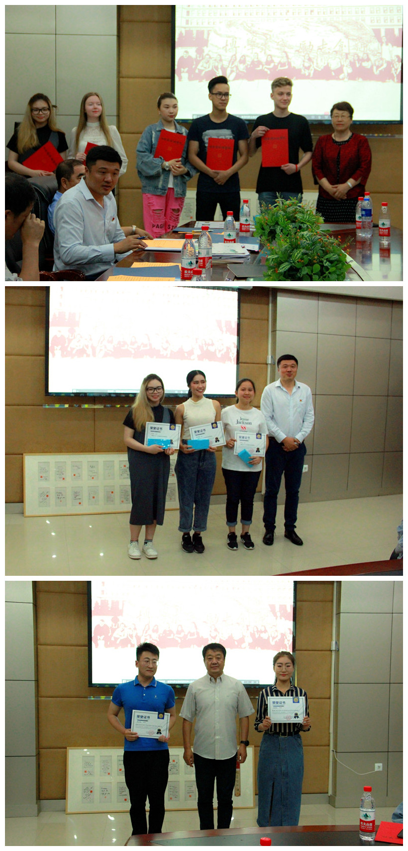 其后,国际教育学院院长周瑞宣布了《关于准予阿德丽娅同学等17名外国留学生结业的决定》,党委副书记杨宏向结业同学代表颁发了《结业证书》。学工处处长宁晶宣布了《关于表彰、奖励2019年春季学期满勤留学生的决定》及获得满勤奖的学生名单,副校长冯研向获得满勤奖的郑月馨、宝贵及管莹三人颁发了证书和奖品。国际教育学院院长周瑞介绍了国际教育学院国际学生中心的骨干成员——渠少波和刘彦彤,并由校长冯晓为其颁发《关于表彰2018—2019年度国际合作突出贡献奖》。随后,国际学生中心代表刘彦彤与教师代表郑玉婷分别进行了发言。